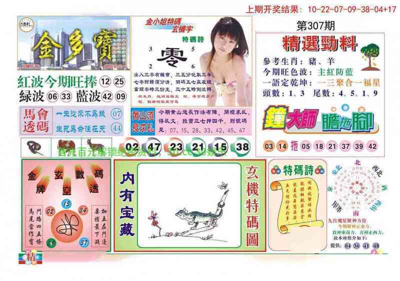 | 307期:金多宝 解:图中一语定乾坤可解大器晚成的生肖,牛蛇马鸡猴狗 综合:牛蛇马鸡猴狗 防特:09.45.10.34.08.20 |