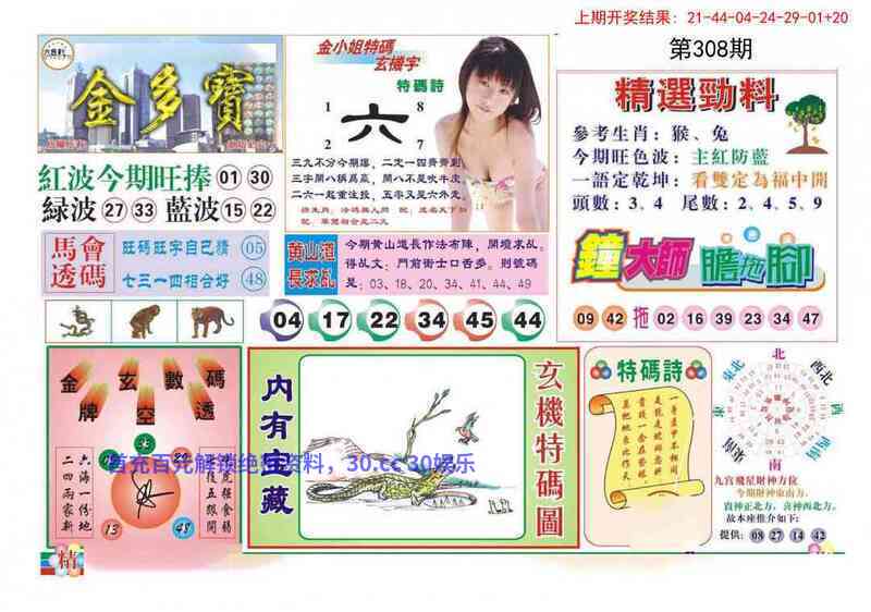 | 308期:金多宝 解:图中一语定乾坤可解人缘极佳的生肖,猪狗兔马鸡猴 综合:猪狗兔马鸡猴 |