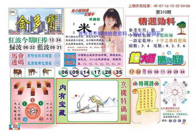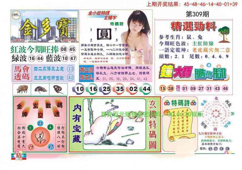 | 309期:金多宝 解:图中一语定乾坤可解心想事成的生肖,龙马蛇鸡鼠狗 综合:龙马蛇鸡鼠狗 防特:33.45.06.18.08.32 |